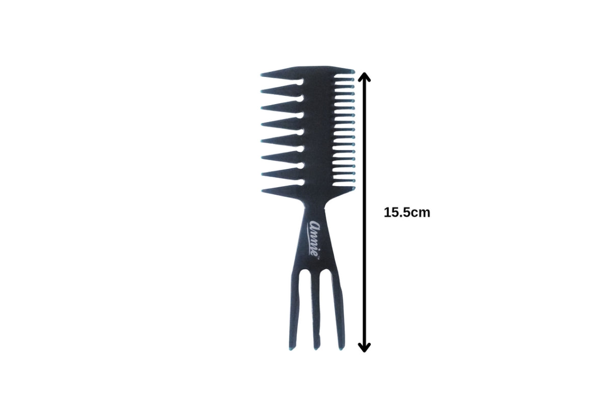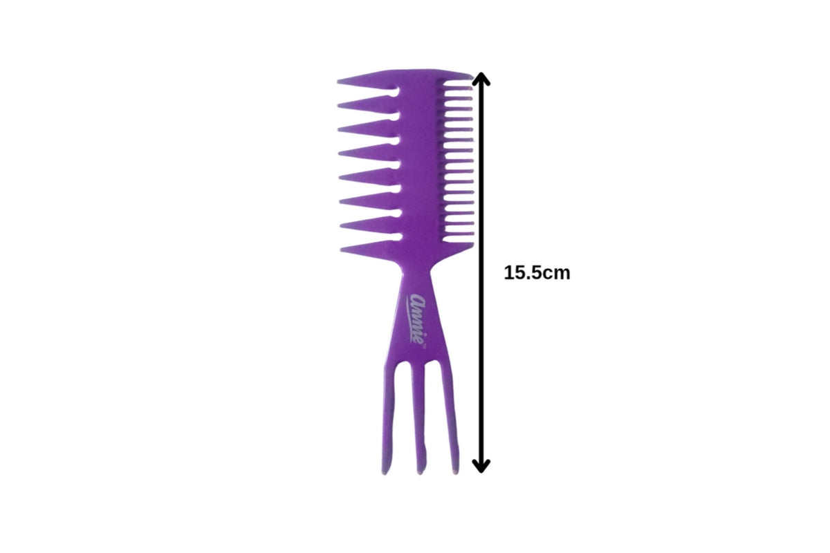This 3-in-1 comb from Annie features three durable plastic tails that can be used for parting or teasing hair. With its wide teeth and pointed tips, it's great for detangling and parting thick hair, while the thinner teeth help straighten hair. The variety of teeth on this comb allows for effortless hair styling and its anti-frizz and anti-static design helps prevent flyaways and promote shiny, healthy-looking hair. This heat-resistant comb is perfect for use with hot styling tools and is gentle on hair, preventing breakage and damage. Whether you have long, curly, or Afro hair, this detangling comb makes it easy to remove knots and tangles without causing damage.