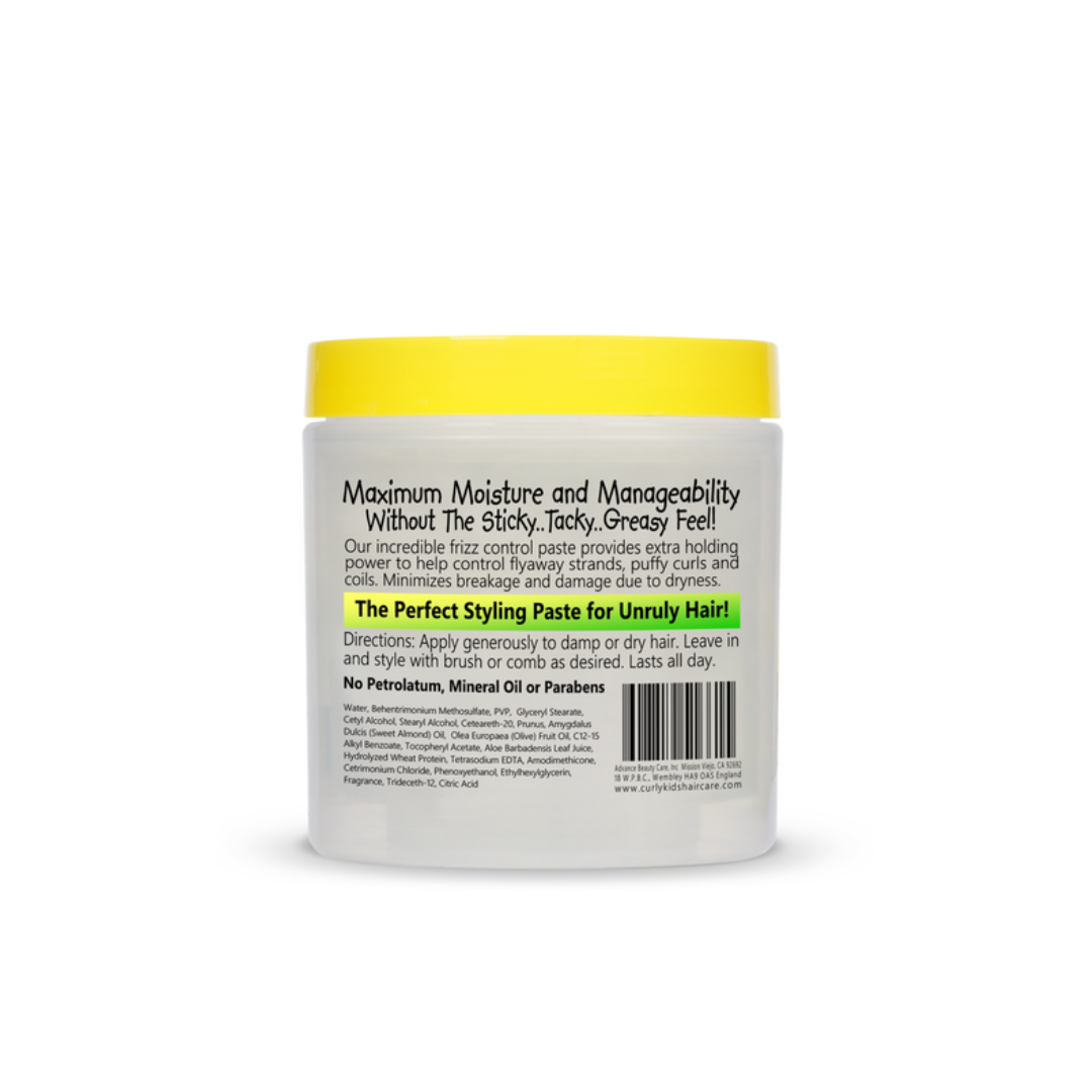 Unleash your curly kid's style with this Frizz Control Paste. This versatile product not only holds and controls strands, but also moisturizes and conditions for effortless styling and manageability. Perfect for kinky, curly and coily hair types. Let your little one's curls shine with ease!